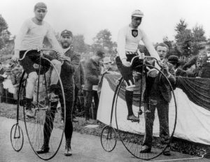 Sportlicher Triumph: 1888 gewinnt August Lehr (rechts) in England auf einem Opel-Hochrad die erste Fahrradweltmeisterschaft